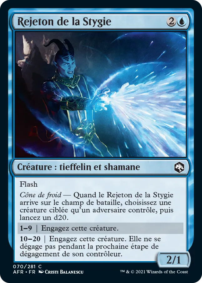 Quand le Rejeton de la Stygie arrive sur le champ de bataille, choisissez une créature ciblée qu'un adversaire contrôle, puis lancez un d20 .