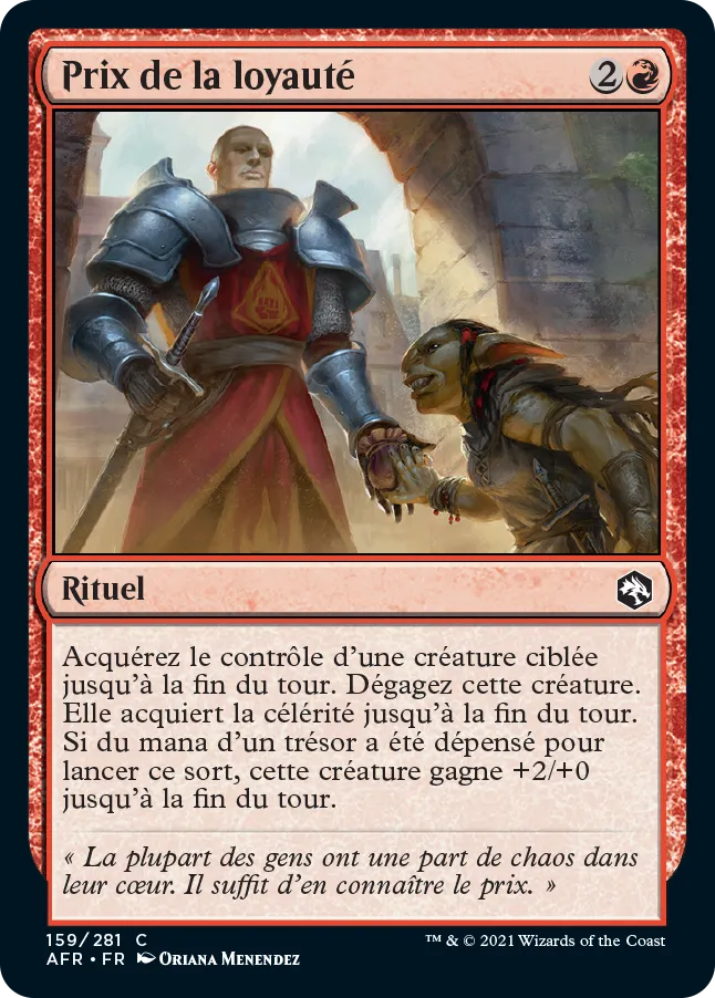 Acquérez le contrôle d'une créature ciblée jusqu'à la fin du tour. Dégagez cette créature. Elle acquiert la célérité jusqu'à la fin du tour. Si du mana d'un Trésor a été dépensé pour lancer ce sort, cette créature gagne +2/+0 jusqu'à la fin du tour.