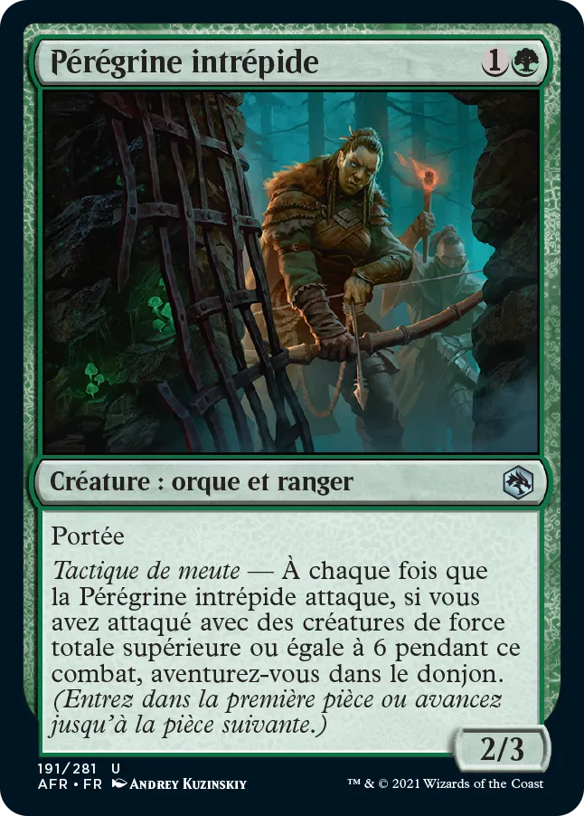 Tactique de meute — À chaque fois que la Pérégrine intrépide attaque, si vous avez attaqué avec des créatures de force totale supérieure ou égale à 6 pendant ce combat, aventurez-vous dans le donjon. (Entrez dans la première pièce ou avancez jusqu'à la pièce suivante.).