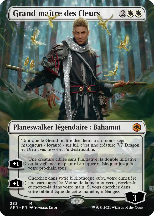 Tant que le Grand maître des fleurs a au moins sept marqueurs "loyauté" sur lui, c'est une créature 7/7 Dragon et Dieu créature avec le vol et l'indestructible.