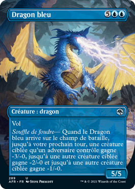 Quand le Dragon bleu arrive sur le champ de bataille, jusqu'à votre prochain tour, une créature ciblée qu'un adversaire contrôle gagne -3/-0, jusqu'à une autre créature ciblée gagne -2/-0 et jusqu'à une autre créature ciblée gagne -1/-0.