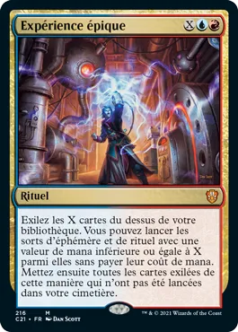 Exilez les X cartes du dessus de votre bibliothèque. Vous pouvez lancer les sorts d'éphémère et de rituel avec une valeur de mana inférieure ou égale à X parmi elles sans payer leur coût de mana. Mettez ensuite toutes les cartes exilées de cette manière qui n'ont pas été lancées dans votre cimetière.