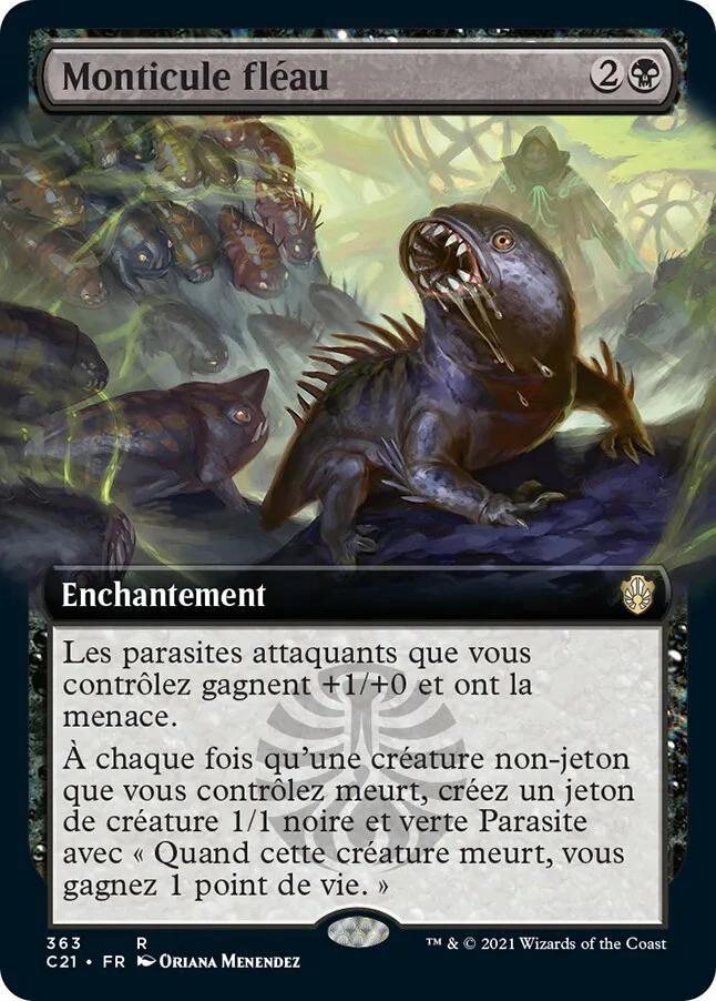 À chaque fois qu'une créature non-jeton que vous contrôlez meurt, créez un jeton de créature 1/1 noire et verte Parasite avec "Quand cette créature meurt, vous gagnez 1 point de vie.".