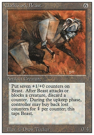 : Put up to X +1/+0 counters on Clockwork Beast. This ability can't cause the total number of +1/+0 counters on Clockwork Beast to be greater than seven. Activate this ability only during your upkeep.