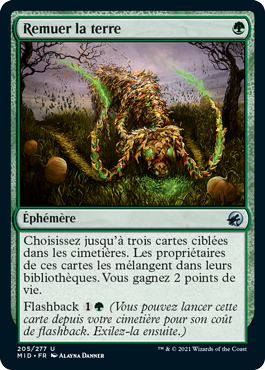 Choisissez jusqu'à trois cartes ciblées dans les cimetières. Les propriétaires de ces cartes les mélangent dans leurs bibliothèques. Vous gagnez 2 points de vie.