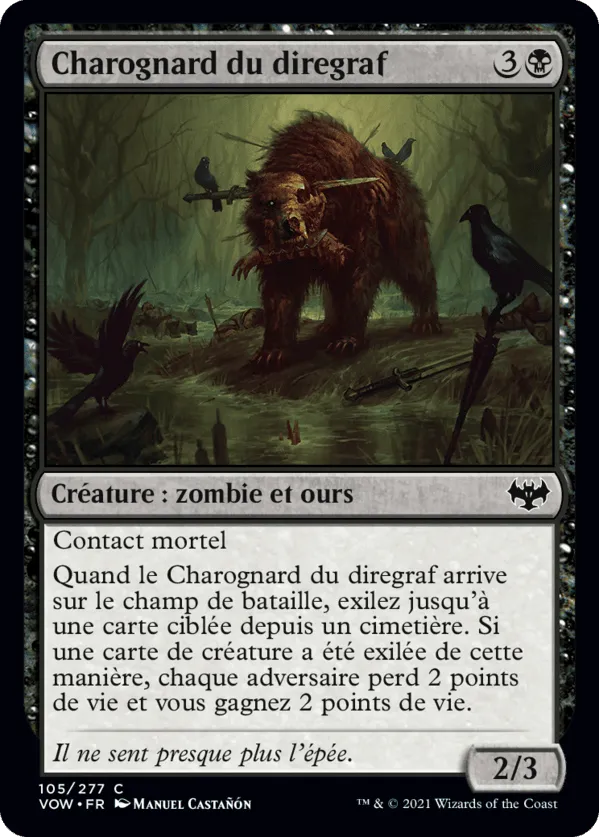 Quand le Charognard du diregraf arrive sur le champ de bataille , exilez jusqu'à une carte ciblée depouis un cimetière. Si une carte de créature a été exilée de cette manière , chaque adversaire perd 2 points de vie et vous gagnez 2 points de vie.