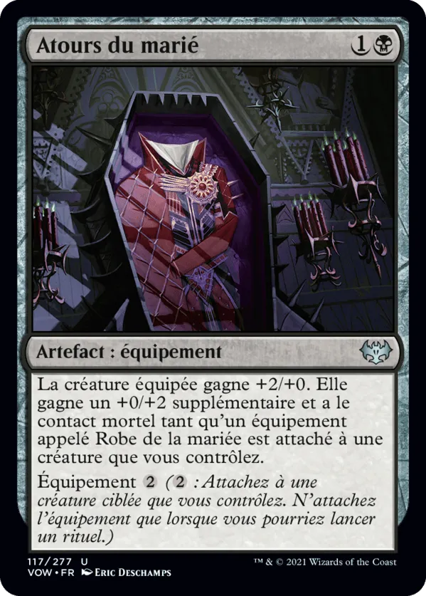 La créature équipée gagne +2/+0. Elle gagne un +0/+2 supplémentaire et a le contact mortel tant qu'un équipement appelé Robe de la mariée est attaché à une créature que vous contrôlez.