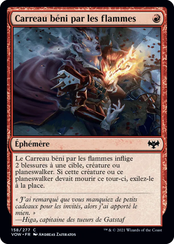 Le Carreau béni par les flammes inflige 2 blessures à une cible, créature ou planeswalker. Si cette créature ou ce planeswalker devait mourir ce tour-ci, exilez-le à la place.