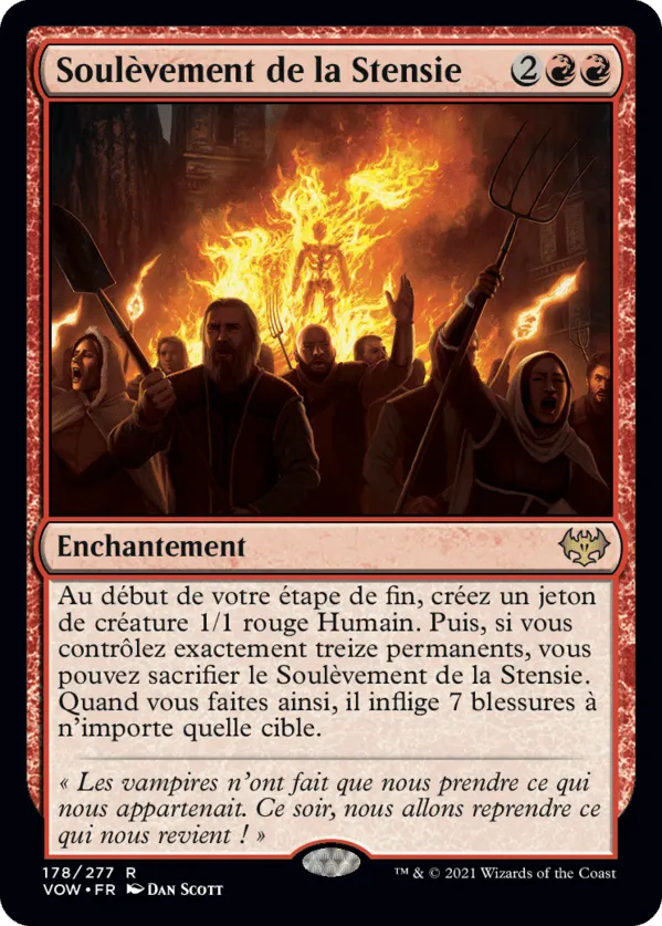 Au début de votre étape de fin, créez un jeton de créature 1/1 rouge Humain. Ensuite, si vous contrôlez exactement treize permanents, vous pouvez sacrifier Stensia Uprising. Quand vous faites ainsi, il inflige 7 blessures à n'importe quelle cible.