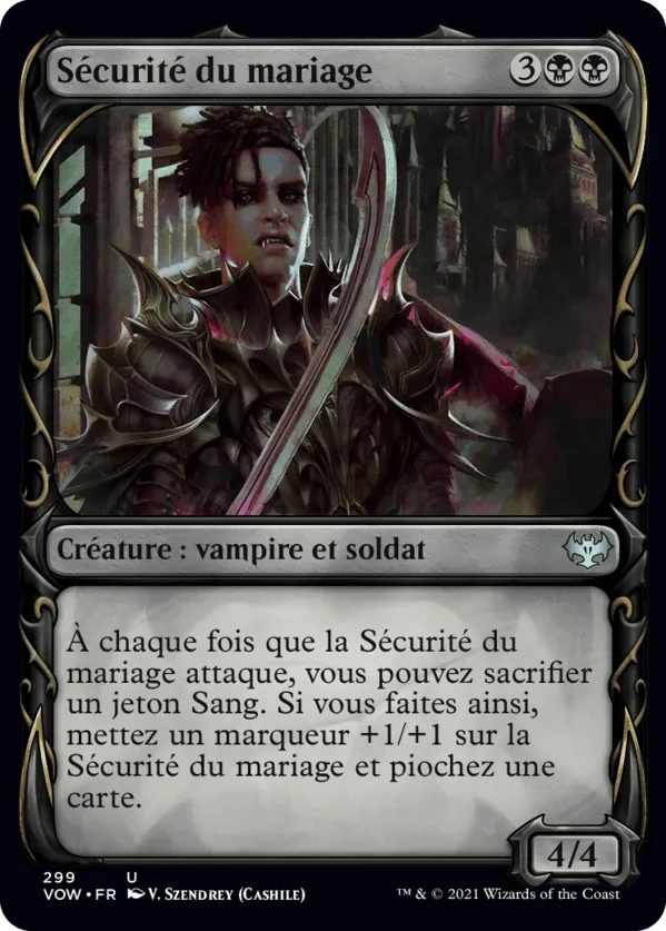 À chaque fois que Wedding Security attaque, vous pouvez sacrifier un jeton Sang. Si vous faites ainsi, mettez un marqueur +1/+1 sur Wedding Security et piochez une carte.