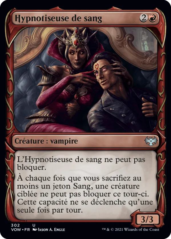 À chaque fois que vous sacrifiez au moins un jeton Sang, une créature ciblée ne peut pas bloquer ce tour-ci. Cette capacité ne se déclenche qu'une seule fois par tour.
