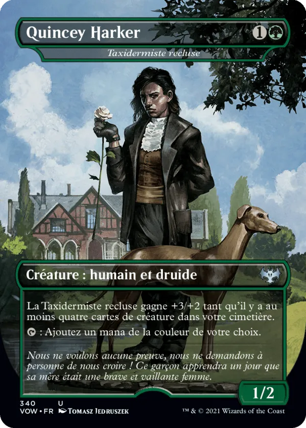 Reclusive Taxidermist gagne +3/+2 tant qu'il y a au moins quatre cartes de créature dans votre cimetière. : Ajoutez un mana de la couleur de votre choix.