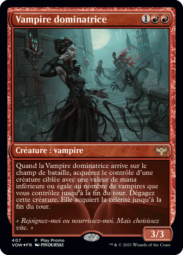 Quand la Vampire dominatrice arrive sur le champ de bataille, acquérez le contrôle d'une créature ciblée avec une valeur de mana inférieure ou égale au nombre de vampires que vous contrôlez jusqu'à la fin du tour. Dégagez cette créature. Elle acquiert la célérité jusqu'à la fin du tour.