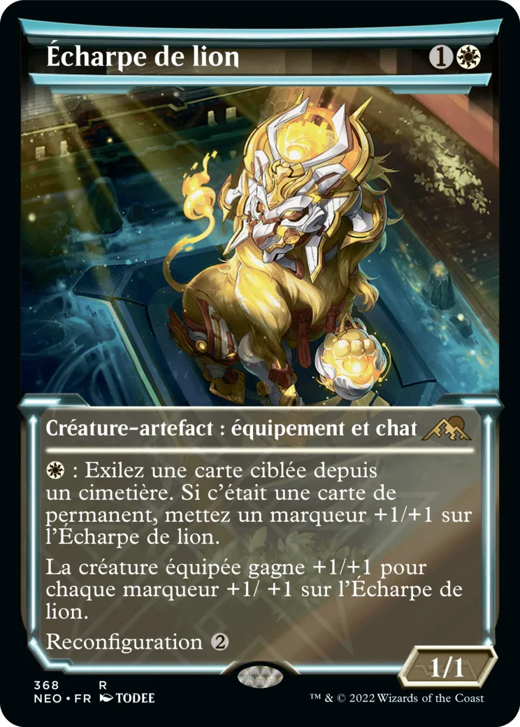 : Exilez une carte ciblée depuis un cimetière. Si c'était une carte de permanent, mettez un marqueur +1/+1 sur l'Écharpe de lion.