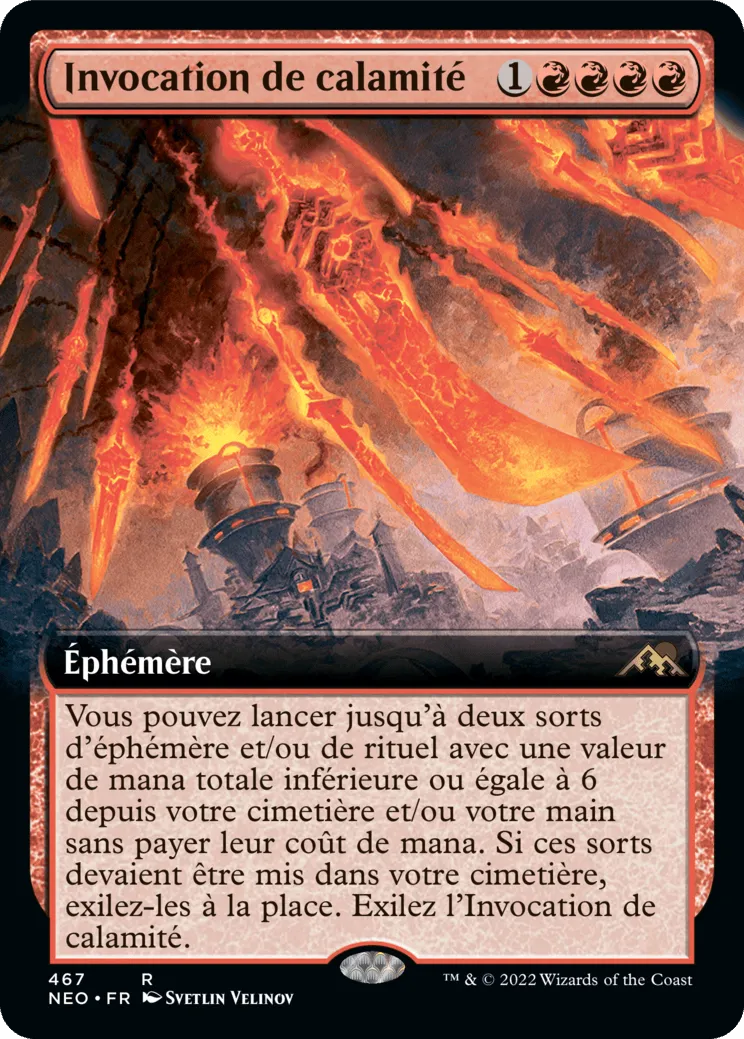 Vous pouvez lancer jusqu'à deux sorts d'éphémère et/ou de rituel avec une valeur de mana totale inférieure ou égale à 6 depuis votre cimetière et/ou votre main sans payer leurs coût de mana. Si ces sorts devaient être mis dans votre cimetière, exilez-les à la place. Exilez l'Invocation de calamité.