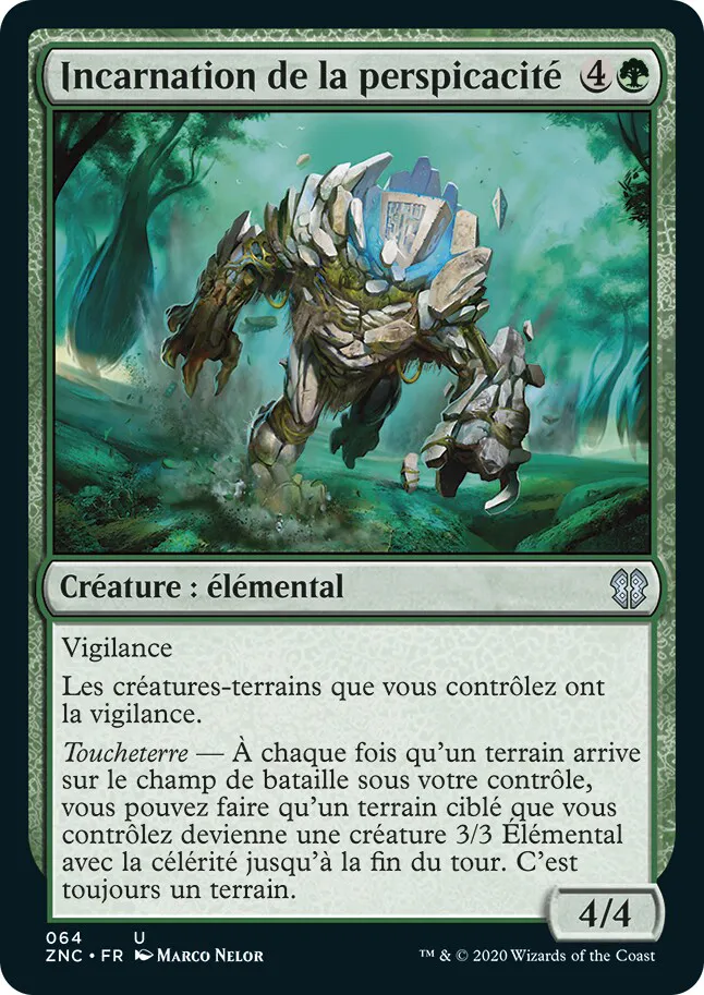 Toucheterre — À chaque fois qu'un terrain arrive sur le champ de bataille sous votre contrôle, vous pouvez faire que le terrain ciblé que vous contrôlez devienne une créature 3/3 Élémental avec la célérité jusqu'à la fin du tour. C'est toujours un terrain.