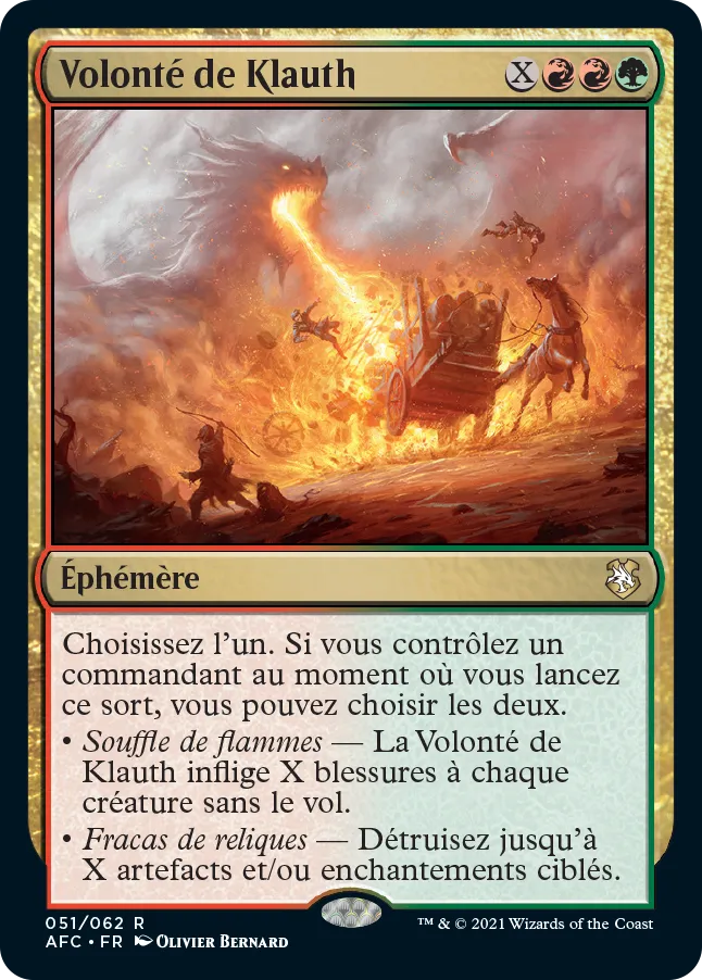 • Souffle de flammes — La Volonté de Klauth inflige X blessures à chaque créature sans le vol.