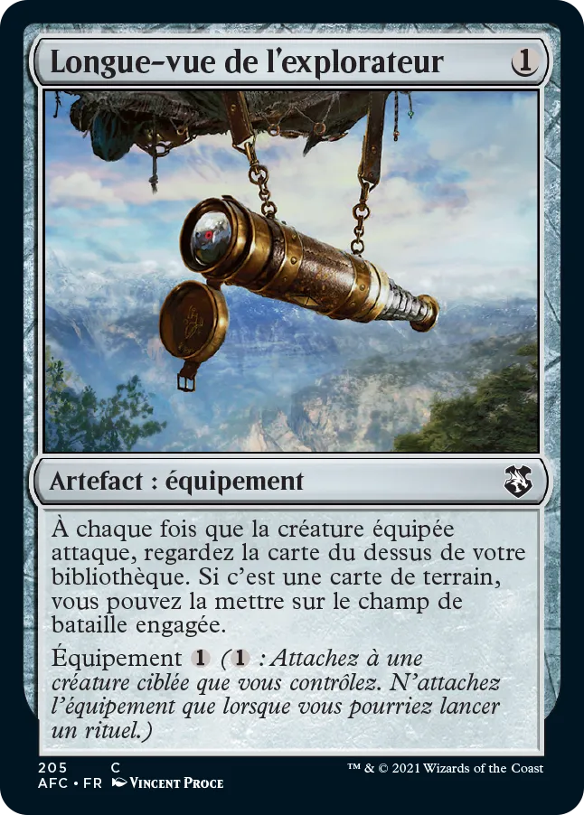 À chaque fois que la créature équipée attaque, regardez la carte du dessus de votre bibliothèque. Si c'est une carte de terrain, vous pouvez la mettre sur le champ de bataille engagée.