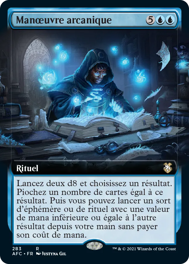 Lancez deux d8 et choisissez un résultat. Piochez un nombre de cartes égal à ce résultat. Ensuite, vous pouvez lancer un sort d'éphémère ou de rituel avec une valeur de mana inférieure ou égale à l'autre résultat depuis votre main sans payer son coût de mana.