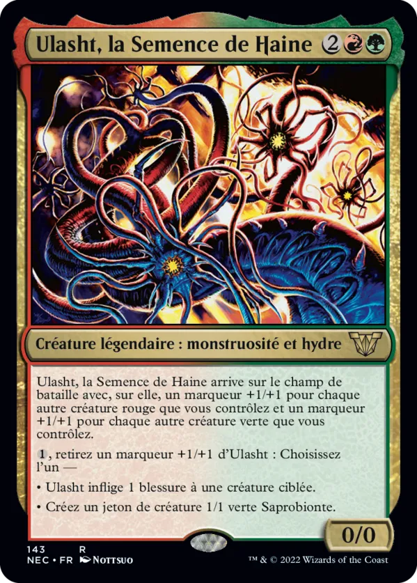 Ulasht, la Semence de Haine arrive sur le champ de bataille avec un marqueur +1/+1 sur elle pour chaque autre créature rouge que vous contrôlez et un marqueur +1/+1 pour chaque autre créature verte que vous contrôlez.