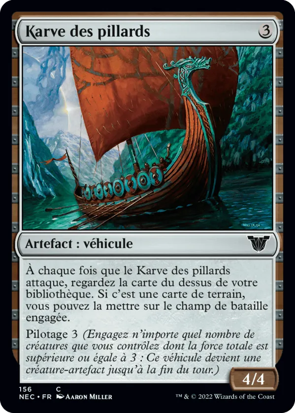À chaque fois que le Karve des pillards attaque, regardez la carte du dessus de votre bibliothèque. Si c'est une carte de terrain, vous pouvez la mettre sur le champ de bataille engagée.