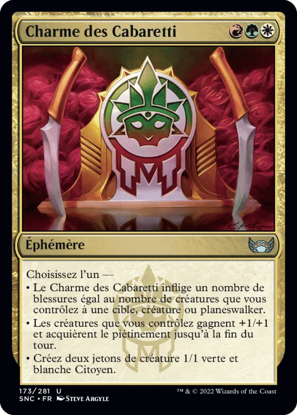 • Le Charme des Cabaretti inflige un nombre de blessures égal au nombre de créatures que vous contrôlez à une cible, créature ou planeswalker.