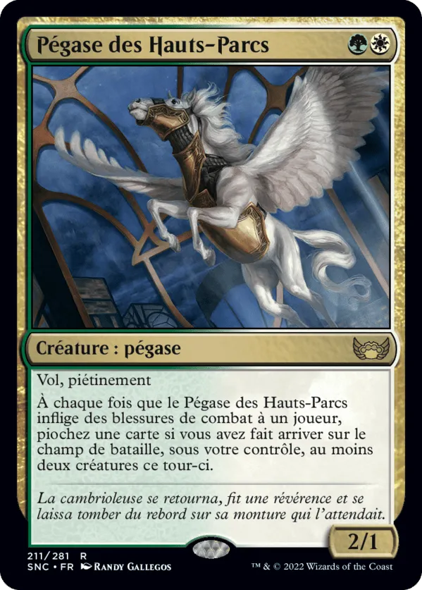 À chaque fois que le Pégase des Hauts-Parcs inflige des blessures de combat à un joueur, piochez une carte si vous avez fait arriver sur le champ de bataille, sous votre contrôle, au moins deux créatures ce tour-ci.