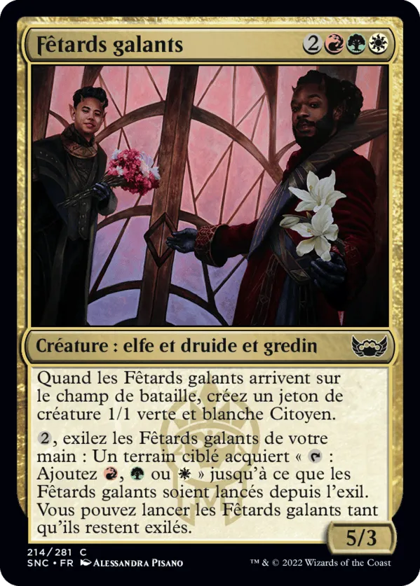 Quand les Fêtards galants arrivent sur le champ de bataille, créez un jeton de créature 1/1 verte et blanche Citoyen.