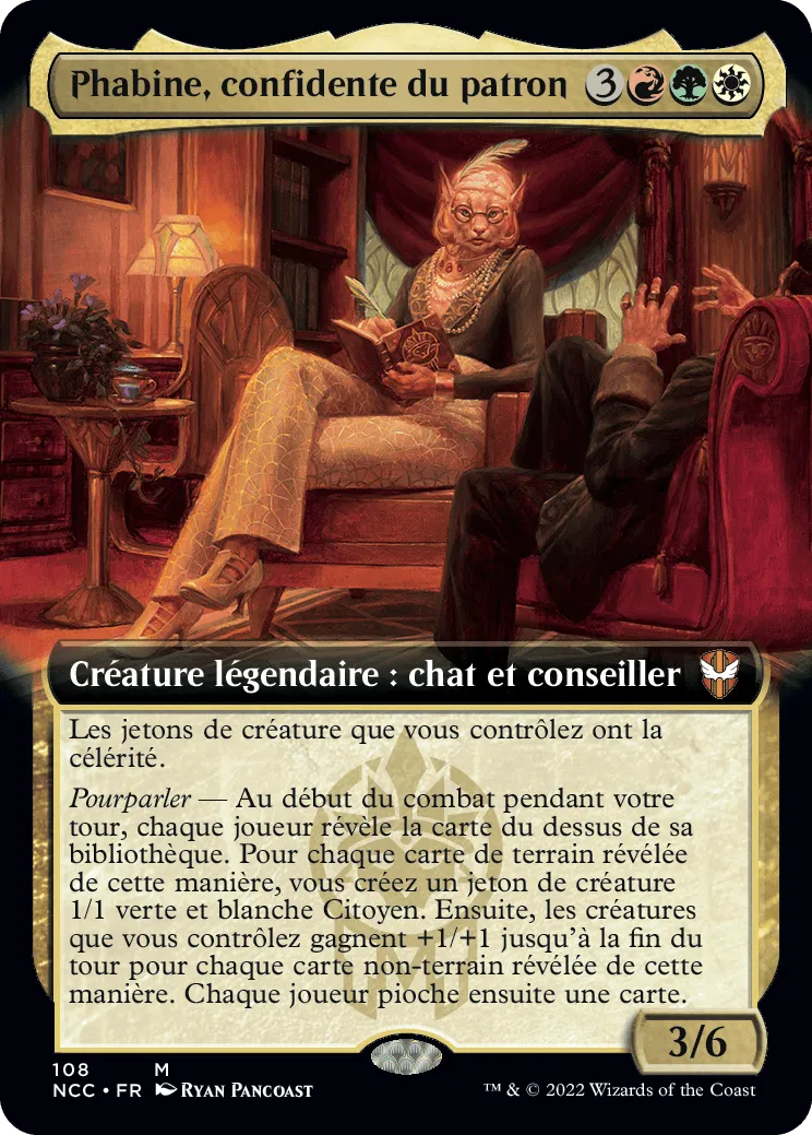 Pourparler — Au début du combat pendant votre tour, chaque joueur révèle la carte du dessus de sa bibliothèque. Pour chaque carte de terrain révélée de cette manière, vous créez un jeton de créature 1/1 verte et blanche Citoyen. Ensuite, les créatures que vous contrôlez gagnent +1/+1 jusqu'à la fin du tour pour chaque non-terrain révélée de cette manière. Chaque joueur pioche ensuite une carte.