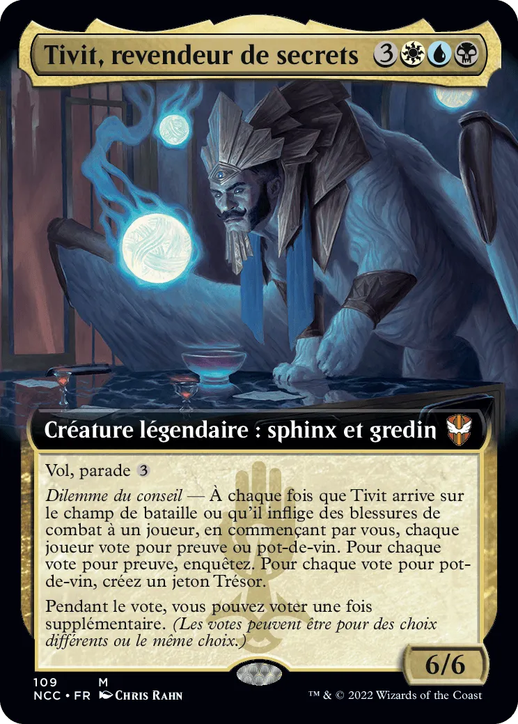 Dilemme du conseil — À chaque fois que Tivit, revendeur de secrets arrive sur le champ de bataille ou qu'il inflige des blessures de combat à un joueur, en commençant par vous, chaque joueur vote pour preuve ou pot-de-vin. Pour chaque vote pour preuve, enquêtez. Pour chaque vote pour pot-de-vin, créez un jeton Trésor.