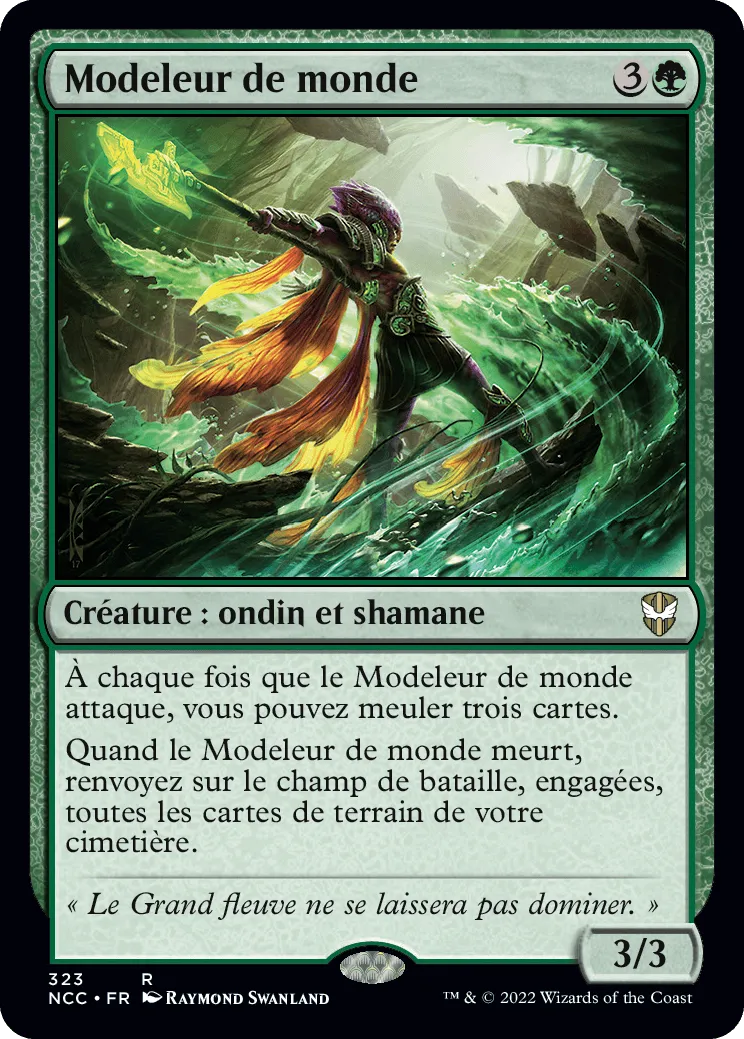 Quand le Modeleur de monde meurt, renvoyez sur le champ de bataille, engagées, toutes les cartes de terrain de votre cimetière.