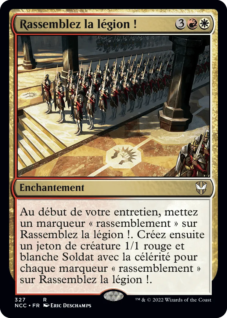 Au début de votre entretien, mettez un marqueur "rassemblement" sur Rassemblez la légion !. Créez ensuite un jeton de créature 1/1 rouge et blanche Soldat avec la célérité pour chaque marqueur "rassemblement" sur Rassemblez la légion !.