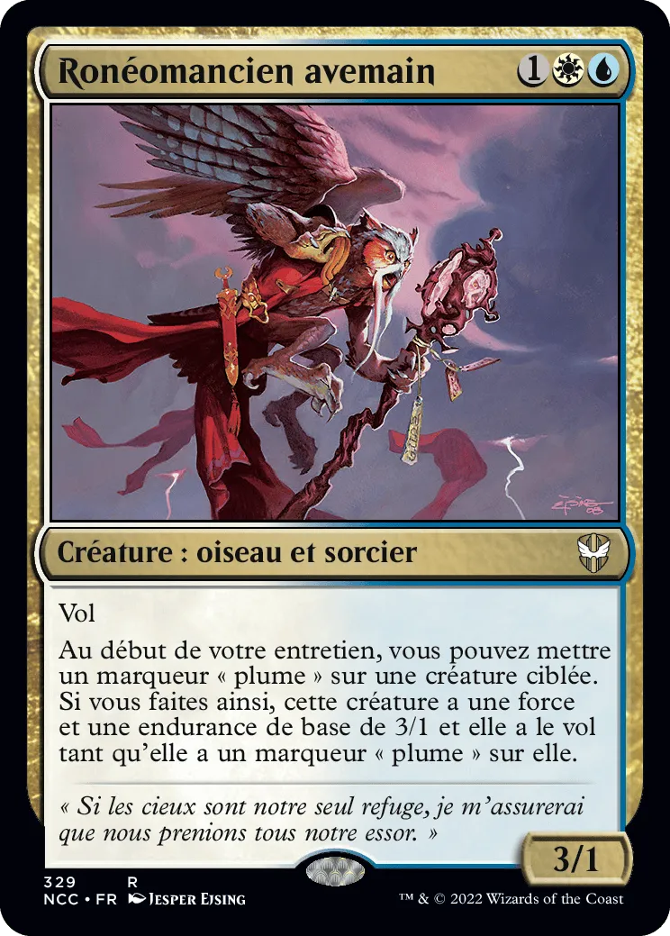 Au début de votre entretien, vous pouvez mettre un marqueur "plume" sur la créature ciblée. Si vous faites ainsi, cette créature a une force et une endurance de base de 3/1 et elle a le vol tant qu'elle a un marqueur "plume" sur elle.