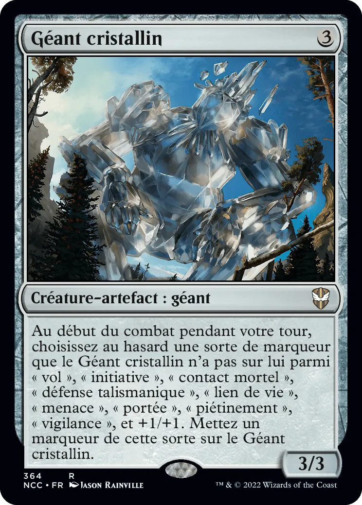 Au début du combat pendant votre tour, choisissez au hasard une sorte de marqueur que le Géant cristallin n'a pas sur lui parmi "vol", "initiative", "contact mortel", "défense talismanique", "lien de vie", "menace", "portée", "piétinement", "vigilance", et +1/+1. Mettez un marqueur de cette sorte sur le Géant cristallin.