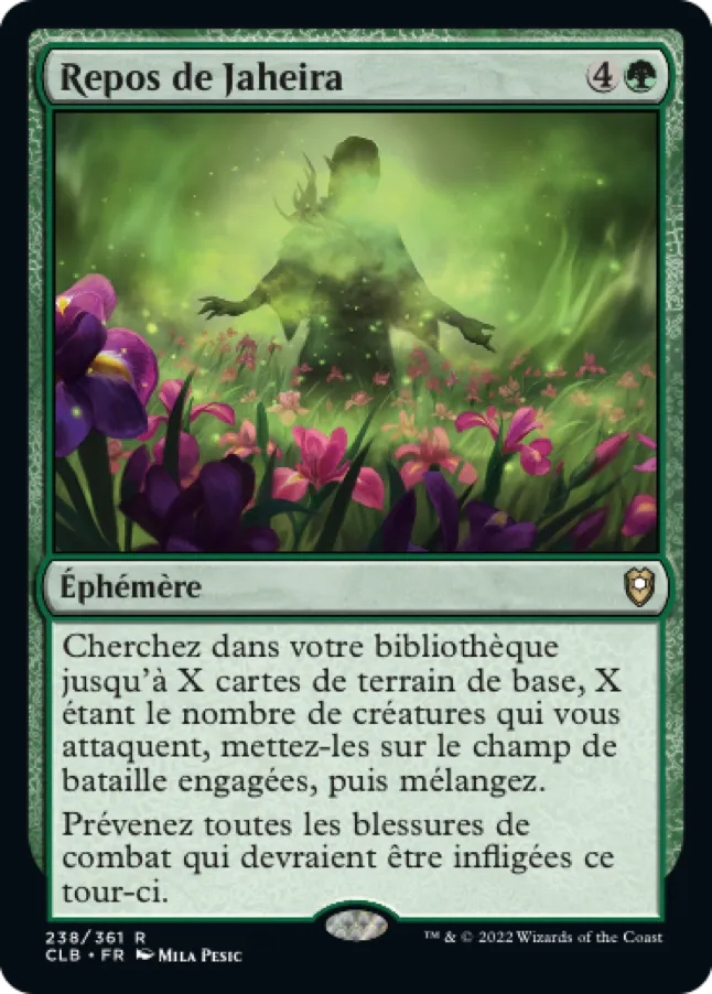 Cherchez dans votre bibliothèque jusqu'à X cartes de terrain de base, X étant le nombre de créatures qui vous attaquent, mettez-les sur le champ de bataille engagées, puis mélangez.