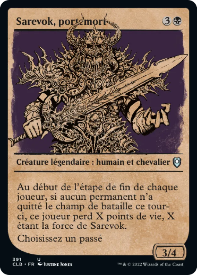 Au début de l'étape de fin de chaque joueur, si aucun permanent n'a quitté le champ de bataille ce tour-ci, ce joueur perd X points de vie, X étant la force de Sarevok.