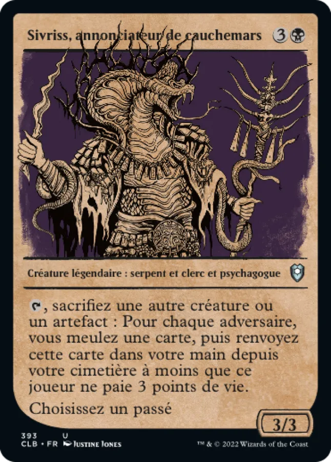 , sacrifiez une autre créature ou un artefact : Pour chaque adversaire, vous meulez une carte, puis renvoyez cette carte dans votre main depuis votre cimetière à moins que ce joueur ne paie 3 points de vie.