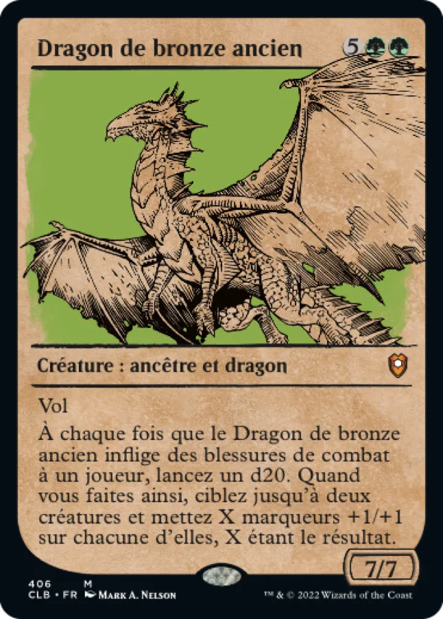 À chaque fois que le Dragon de bronze ancien inflige des blessures de combat à un joueur, lancez un d2. Quand vous faites ainsi, ciblez jusqu'à deux créatures et mettez X marqueurs +1/+1 sur chacune d'elles, X étant le résultat.