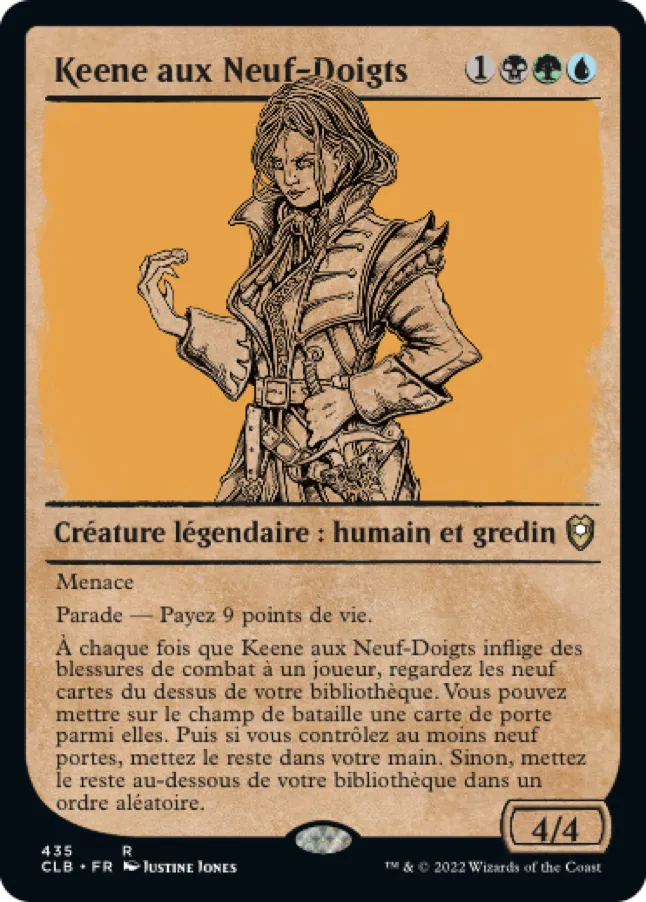 À chaque fois que Keene aux Neuf-Doigts inflige des blessures de combat à un joueur, regardez les neuf cartes du dessus de votre bibliothèque. Vous pouvez mettre sur le champ de bataille une carte de porte parmi elles. Puis si vous contrôlez au moins neuf portes, mettez le reste dans votre main. Sinon, mettez le reste au-dessous de votre bibliothèque dans un ordre aléatoire.