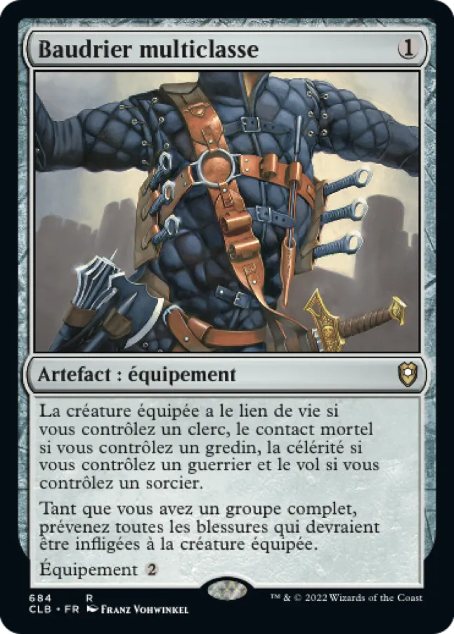 La créature équipée a le lien de vie si vous contrôlez un clerc, le contact mortel si vous contrôlez un gredin, la célérité si vous contrôlez un guerrier et le vol si vous contrôlez un sorcier.