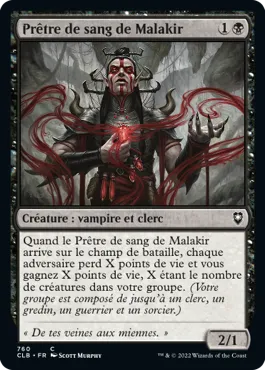 Quand le Prêtre de sang de Malakir arrive sur le champ de bataille, chaque adversaire perd X points de vie et vous gagnez X points de vie, X étant le nombre de créatures dans votre groupe. (Votre groupe est composé de jusqu'à un clerc, un gredin, un guerrier et un sorcier.).