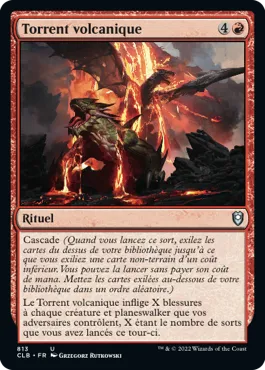 Le Torrent volcanique inflige X blessures à chaque créature et planeswalker que vos adversaires contrôlent, X étant le nombre de sorts que vous avez lancés ce tour-ci.