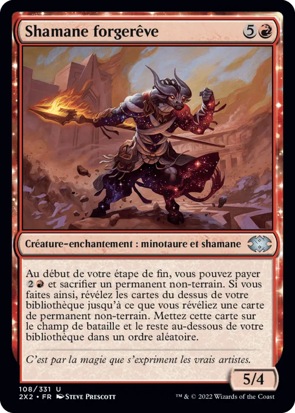 et sacrifier un permanent non-terrain. Si vous faites ainsi, révélez les cartes du dessus de votre bibliothèque jusqu'à ce que vous révéliez une carte de permanent non-terrain. Mettez cette carte sur le champ de bataille et le reste au-dessous de votre bibliothèque dans un ordre aléatoire.