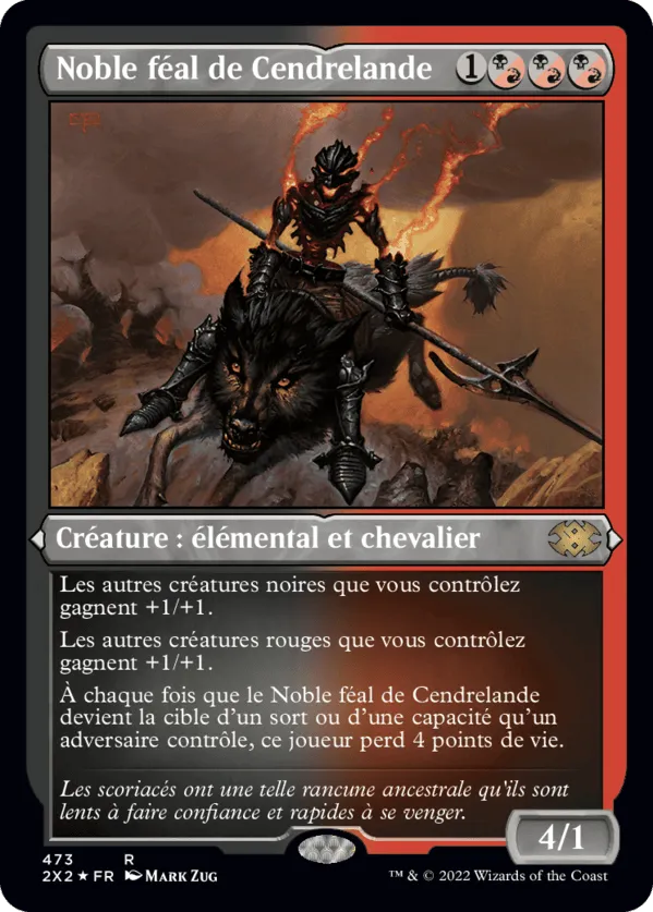 À chaque fois que le Noble féal de Cendrelande devient la cible d'un sort ou d'une capacité qu'un adversaire contrôle, ce joueur perd 4 points de vie.