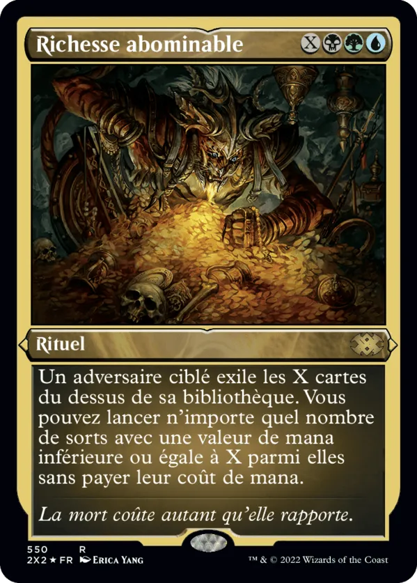 L'adversaire ciblé exile les X cartes du dessus de sa bibliothèque. Parmi elles, vous pouvez lancer n'importe quel nombre de sorts avec une valeur de mana inférieure ou égale à X sans payer leurs coûts de mana.