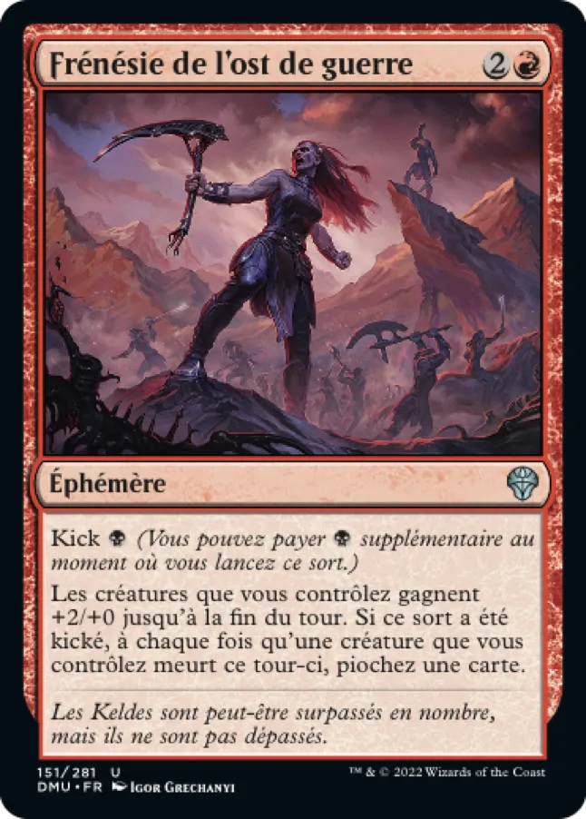 Les créatures que vous contrôlez gagnent +2/+0 jusqu'à la fin du tour. Si ce sort a été kické, à chaque fois qu'une créature que vous contrôlez meurt ce tour-ci, piochez une carte.