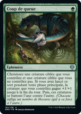 Choisissez une créature ciblée que vous contrôlez et une créature ciblée que vous ne contrôlez pas. Si vous avez lancé ce sort pendant votre phase principale, la créature que vous contrôlez gagne +1/+1 jusqu'à la fin du tour. Puis, ces créatures se battent l'une contre l'autre.