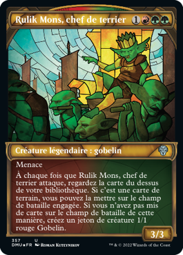 À chaque fois que Rulik Mons, chef de terrier attaque, regardez la carte du dessus de votre bibliothèque. Si c'est une carte de terrain, vous pouvez la mettre sur le champ de bataille engagée. Si vous n'avez pas mis de carte sur le champ de bataille de cette manière, créez un jeton de créature 1/1 rouge Gobelin.