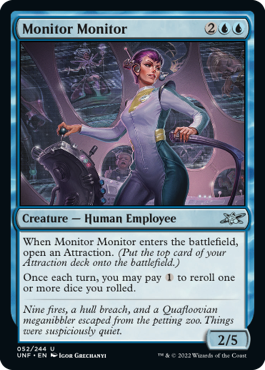 Quand Monitor Monitor arrive sur le champ de bataille, ouvrez une attraction. (Mettez la carte du dessus de votre deck d'attractions sur le champ de bataille.)