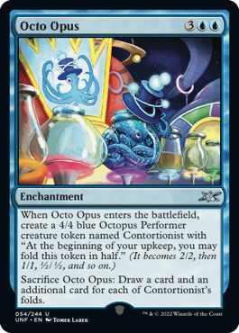 Quand Octo Opus arrive sur le champ de bataille, créez un jeton de créature 4/4 bleue Pieuvre et Interprète Appelé Contortioniste avec "Au début de votre entretien, vous pouvez plier ce jeton en deux." (Il devient 2/2, puis 1/1, ½/½, et ainsi de suite.)